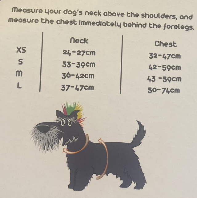 They're available in 4 fully adjustable sizes. Measure your dog at the base of the neck, and just behind their front paws.